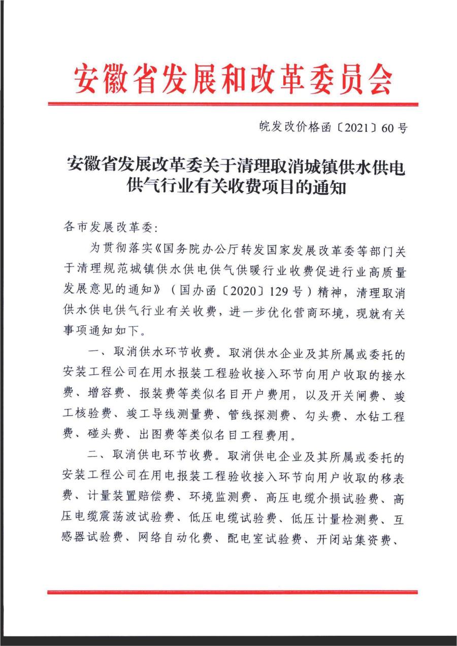 安徽省發展改革委發布關于清理取消城鎮供水供電供氣行業有關收費項目的通知》皖發改價格函【2021】60號