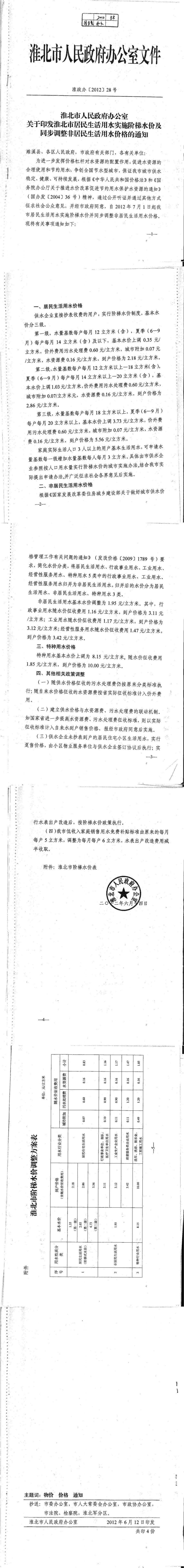淮北市人民政府關(guān)于印發(fā)淮北市居民生活用水實(shí)施階梯水價及同步調(diào)整非居民生活用水價格的通知 淮政辦【2012】28號