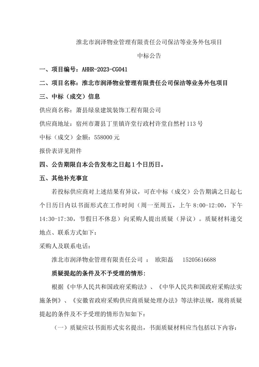 淮北市潤澤物業(yè)管理有限責(zé)任公司保潔等業(yè)務(wù)外包項(xiàng)目中標(biāo)公告