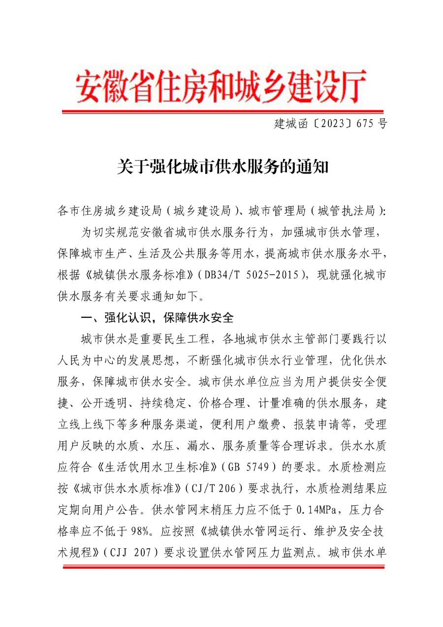 安徽省住房和城鄉建設廳關于強化城市供水服務的通知