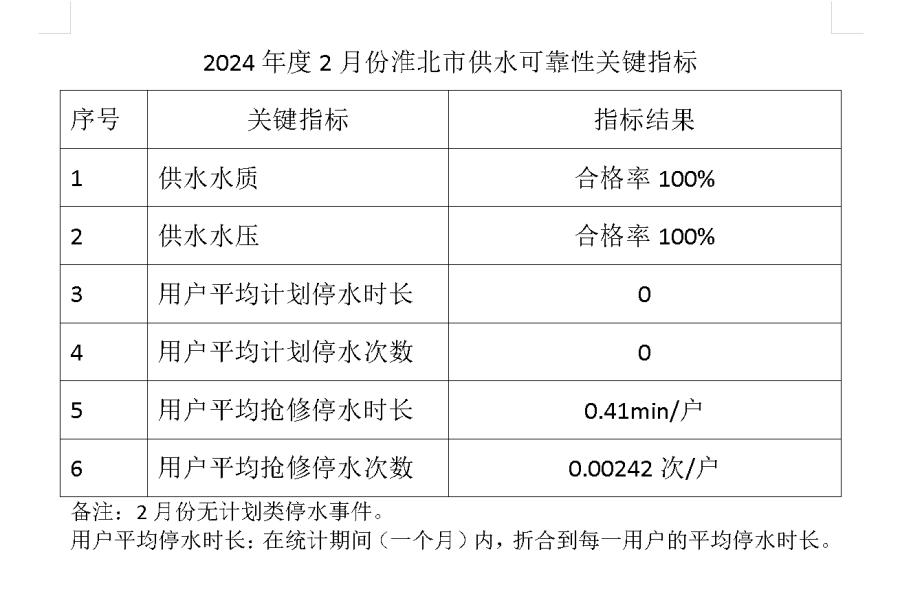 2024年度2月份淮北市供水可靠性關(guān)鍵指標(biāo)