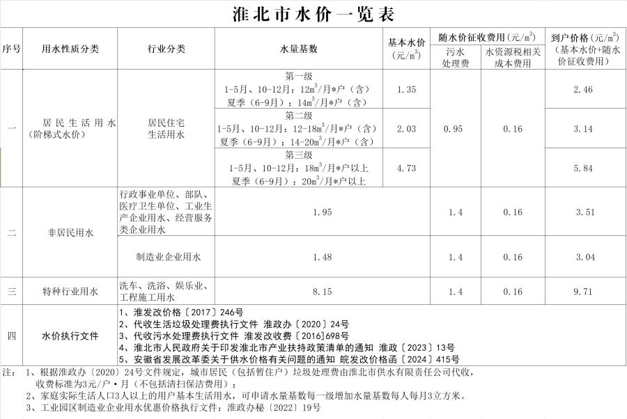 淮北市水價一覽表